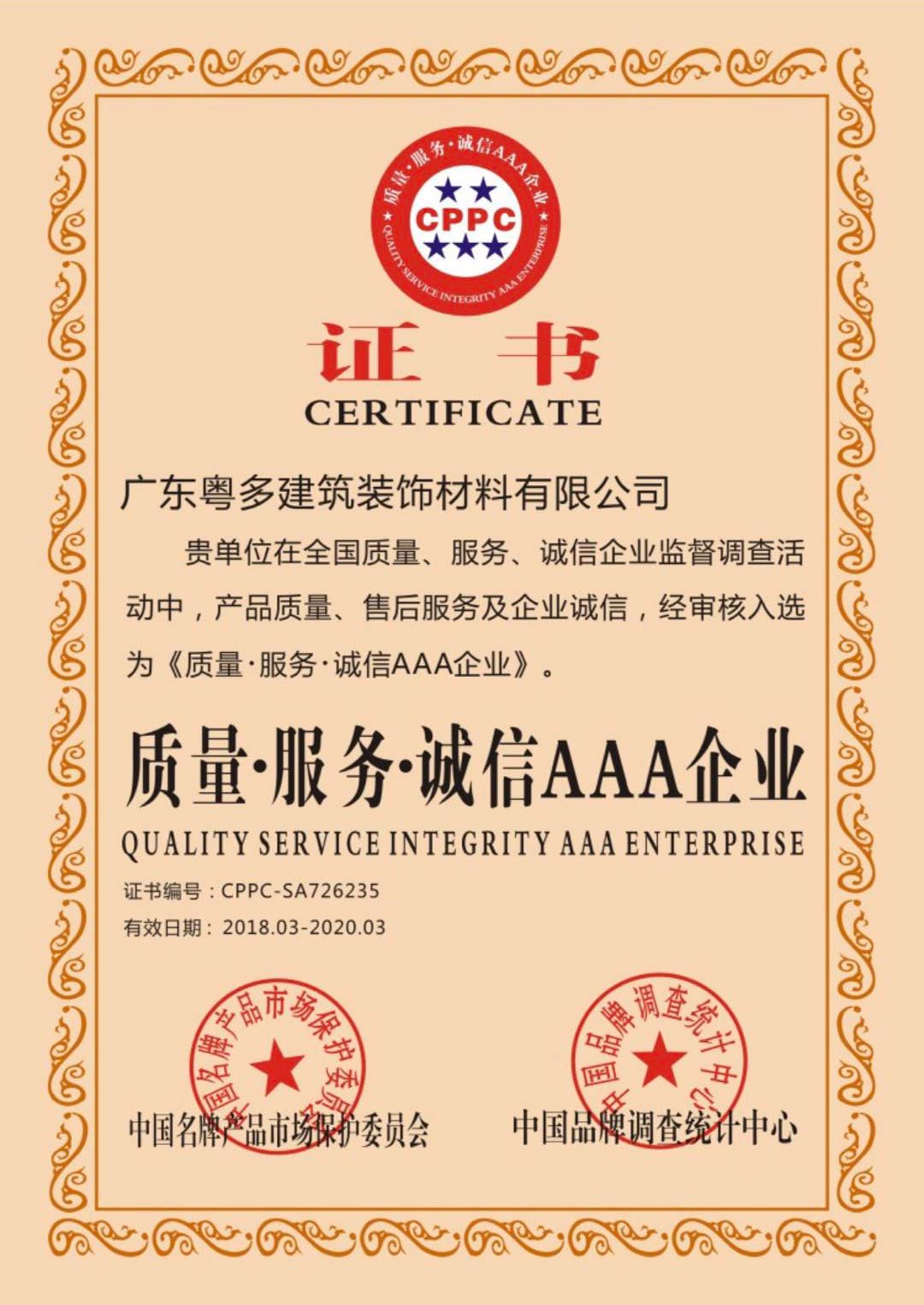 产品名称:质量、服务、诚信AAA企业证书
